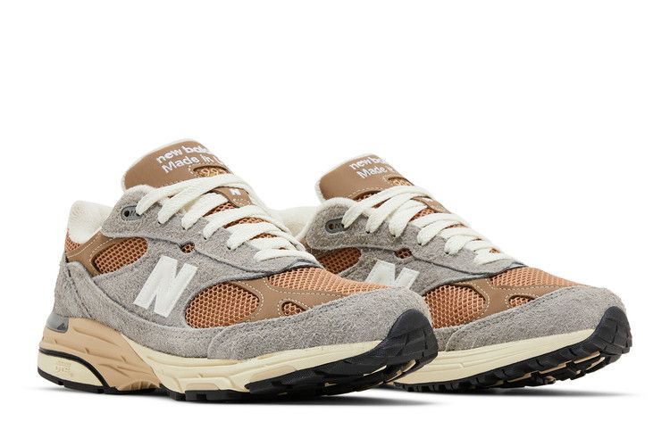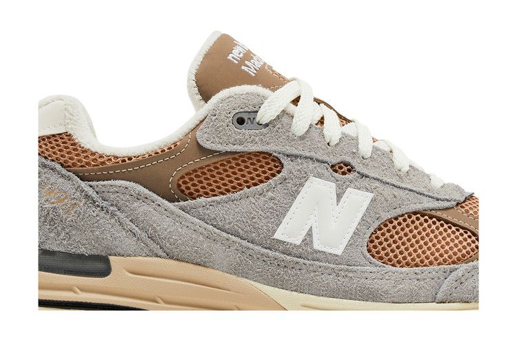 The New Balance 993 Teddy Santis MiUSA Shadow Grey Driftwood features a breathable mesh upper with grey suede overlays for durability. Synthetic panels enhance structure, while terrycloth lining ensures comfort. The ACTEVA midsole provides responsive cushioning, paired with Ndurance rubber for outsole durability. Subtle branding includes the "N" logo and star-spangled heel details.