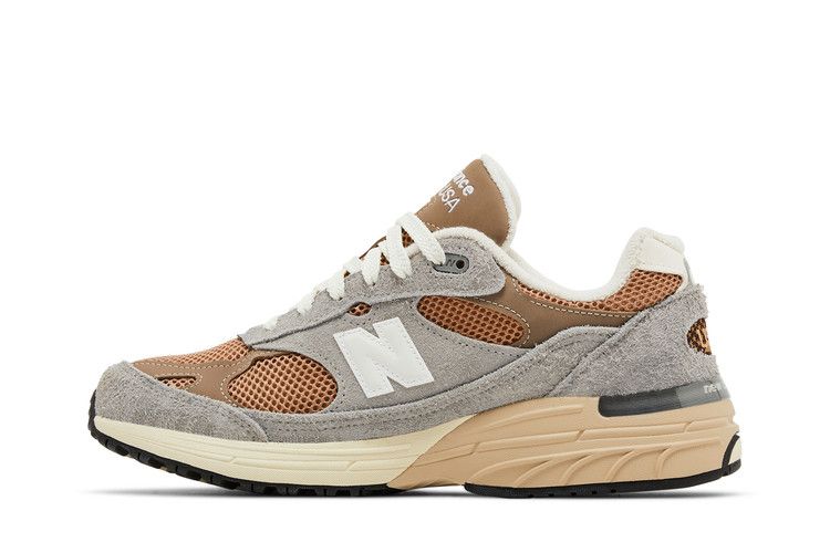 The New Balance 993 Teddy Santis MiUSA Shadow Grey Driftwood features a breathable mesh upper with grey suede overlays for durability. Synthetic panels enhance structure, while terrycloth lining ensures comfort....