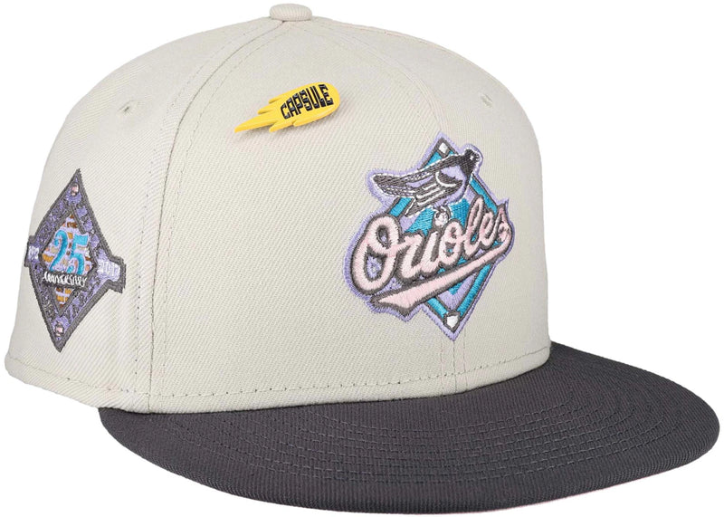 The New Era Baltimore Orioles Capsule Comet Collection 25th Anniversary 59Fifty Fitted Hat Grey/Pink is now available at Side Kicks!