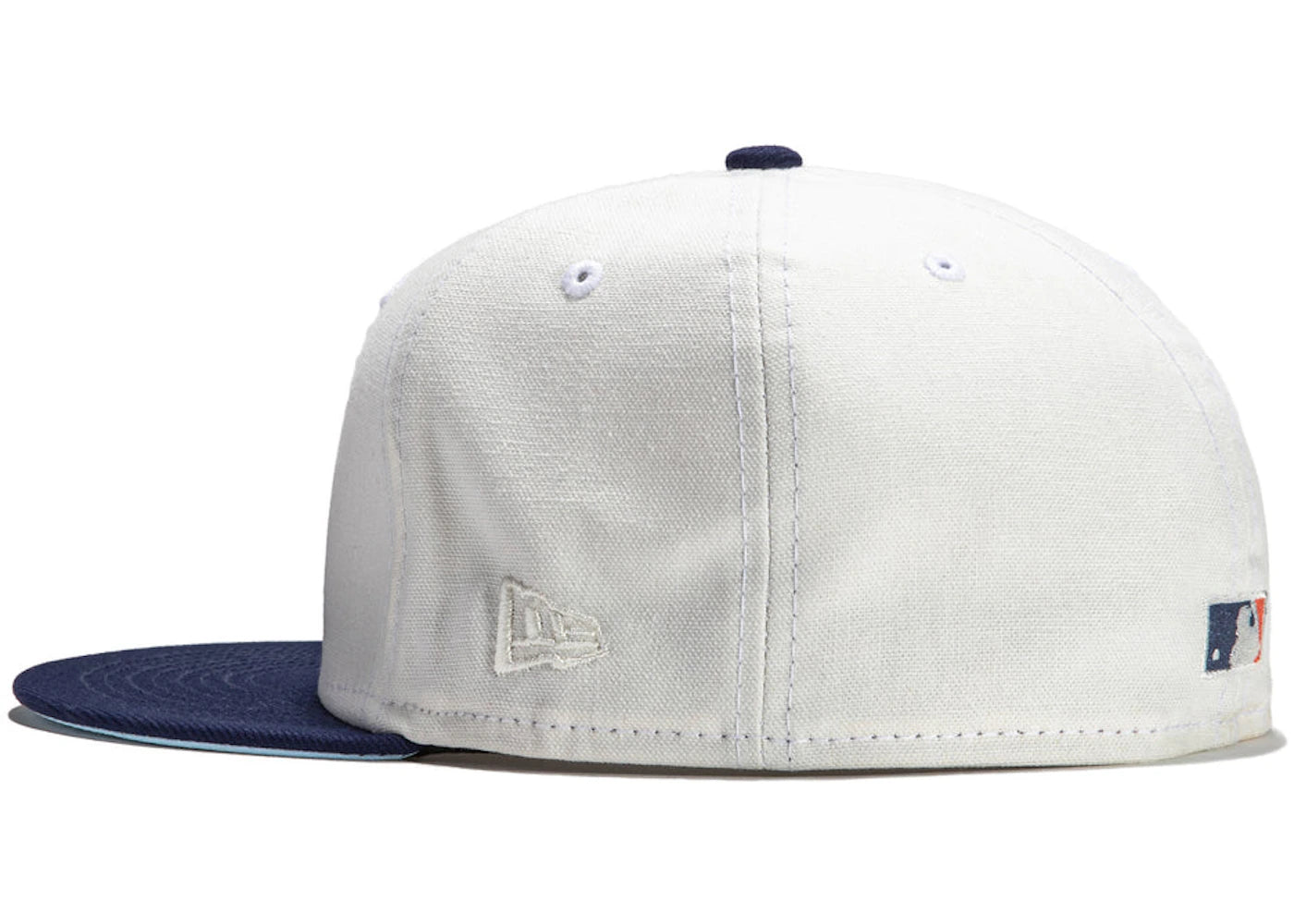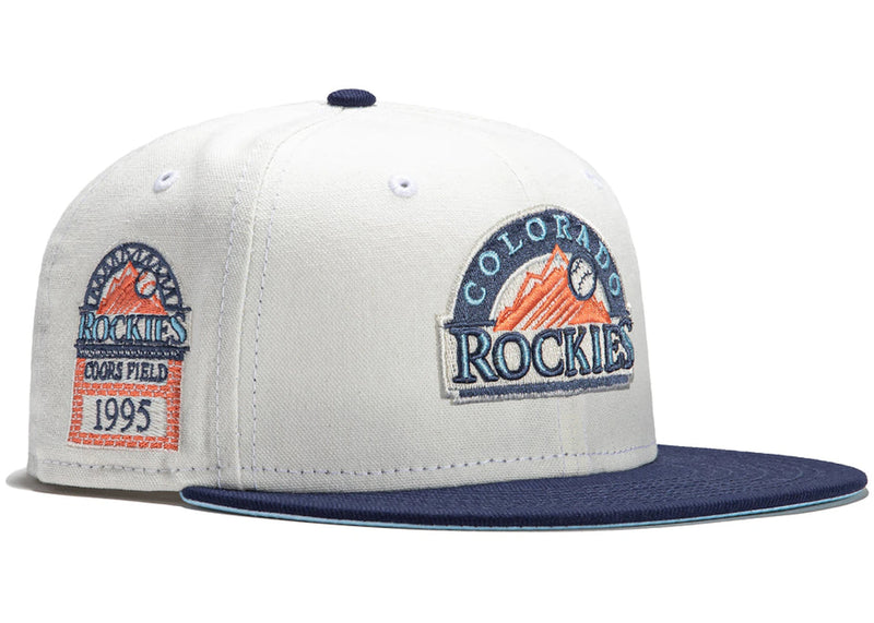 The New Era Colorado Rockies Monaco 1995 Inaugural Patch Logo Hat Club Exclusive 59Fifty Fitted Hat Stone/Peach is now available at Side Kicks!