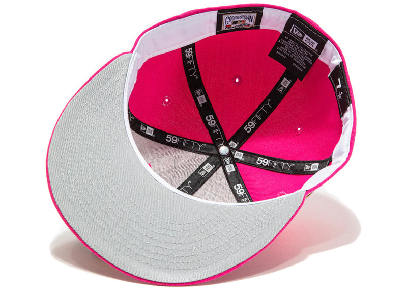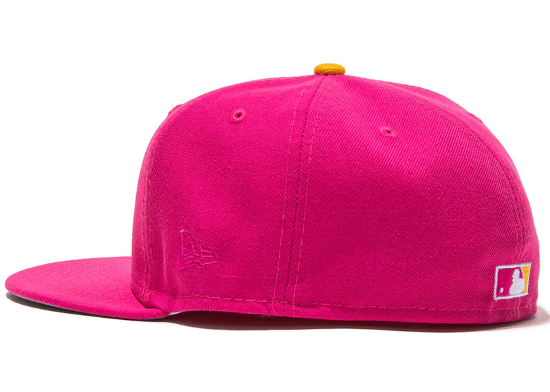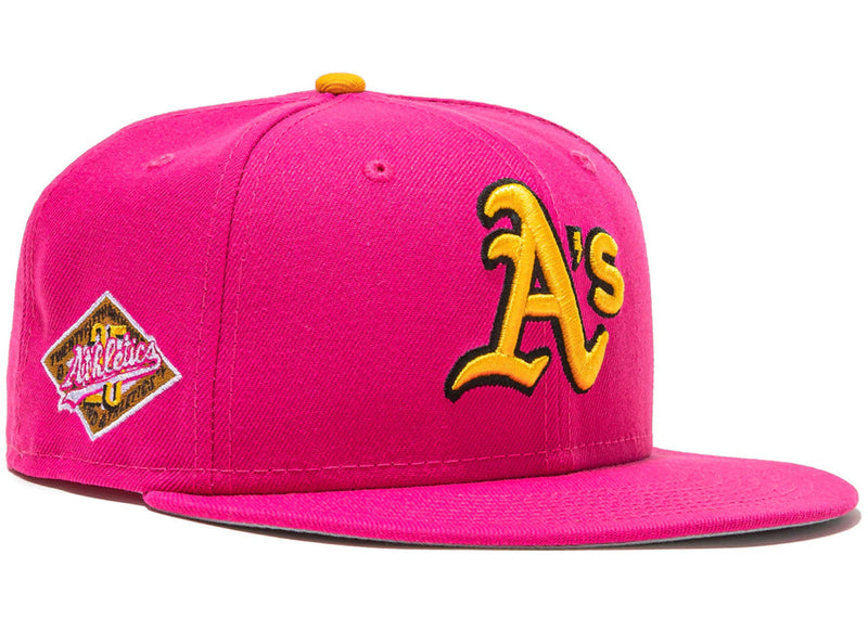 The New Era Oakland Athletics Beer Pack 25th Anniversary Patch Hat Club Exclusive 59Fifty Fitted Hat Magenta/Yellow is now available at Side Kicks!
