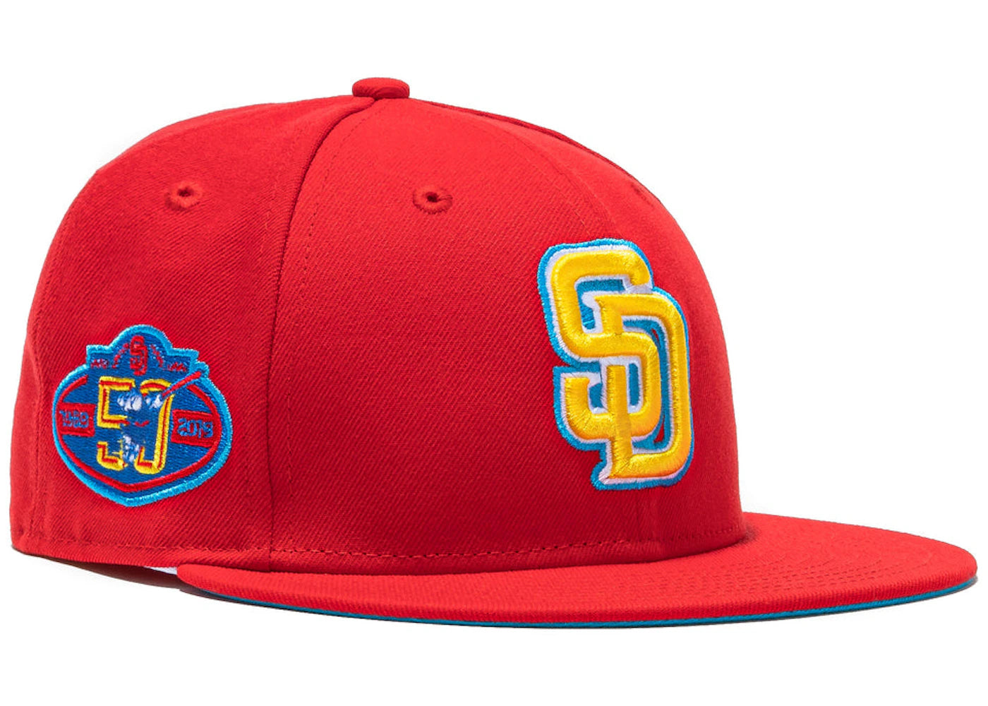 The New Era San Diego Padres Hat Wheels 50th Anniversary Patch Hat Club Exclusive 59Fifty Fitted Hat Red is now available at Side Kicks!