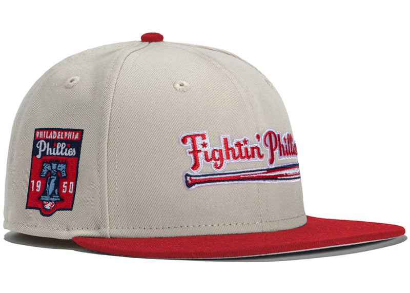 The New Era x Hat Club Exclusive Stone Dome Philadelphia Phillies 1950 Patch Fightin Phillies 59Fifty Fitted Hat Stone is now available at Side Kicks!