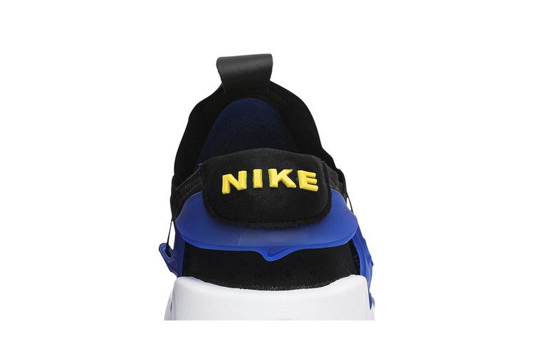 The Nike Adapt Huarache Black Racer Blue (US Charger) features a flexible black mesh upper with Race Blue speckles on the forefoot. It includes an adaptive-fit power-lacing system with yellow...
