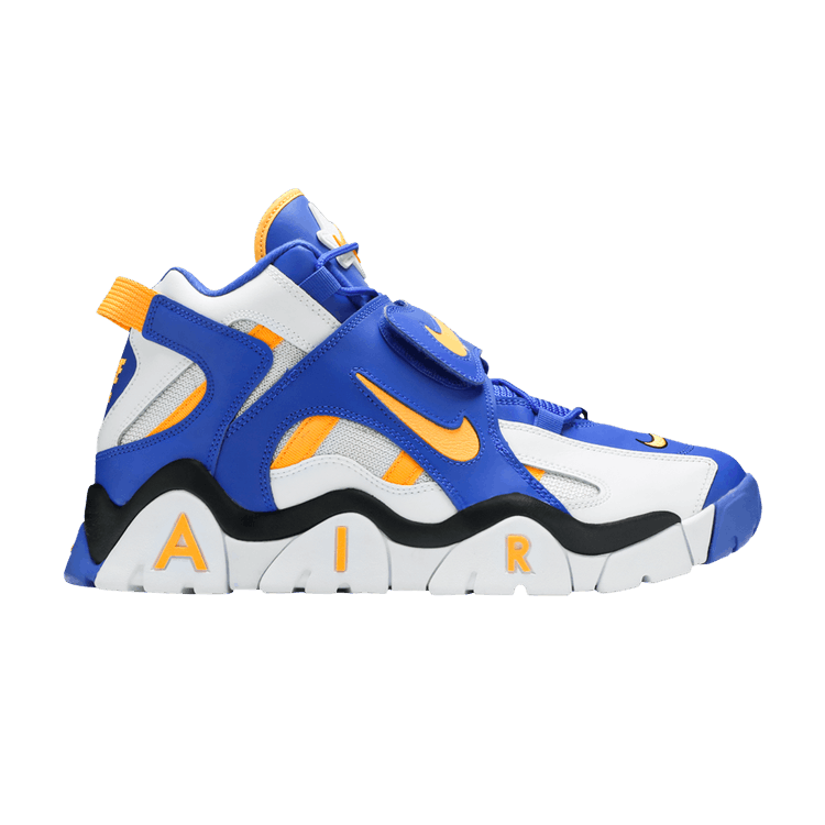 The Nike Air Barrage Mid Rams features a white, laser orange, racer blue, and black colorway inspired by the NFL LA Rams. The mesh and leather upper includes orange detailing...