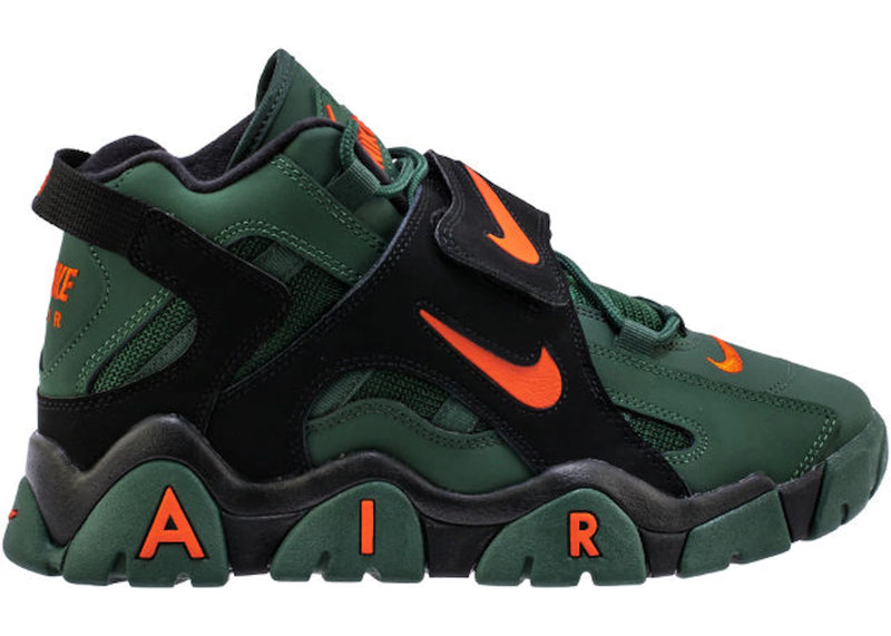 The Nike Air Barrage Mid Super Bowl LIV draws design inspiration from Super Bowl LIV and its Miami host city. The upper combines leather, mesh, and synthetic materials in a layered construction, secured by a midfoot strap for adjustable fit. A visible Air-Sole unit in the heel delivers cushioning and impact absorption. The colorway features vibrant green and orange, paying tribute to the University of Miami Hurricanes. Released on February 1, 2020, the Nike Air Barrage Mid Super Bowl LIV is available now at Side Kicks.