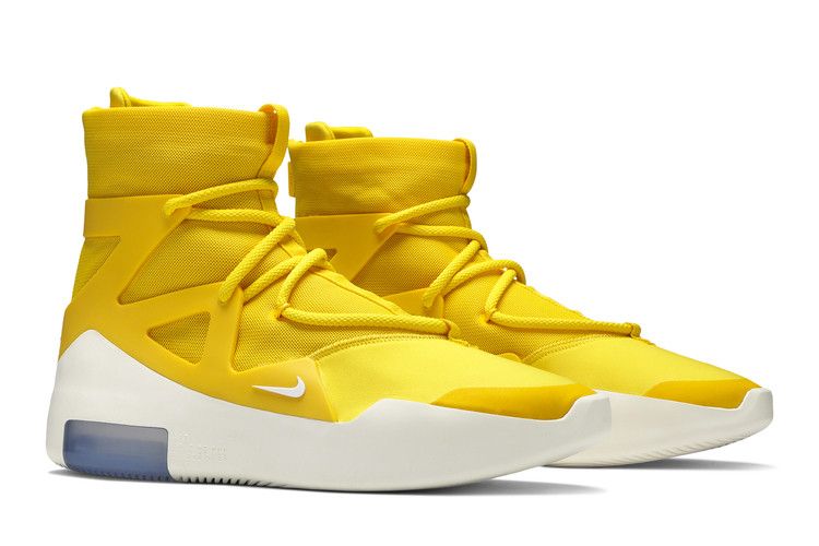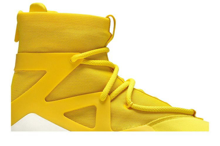The Nike Air Fear Of God 1 "Yellow" features a breathable mesh upper in a bold yellow hue, paired with a TPU heel and cage inspired by the Air Huarache...