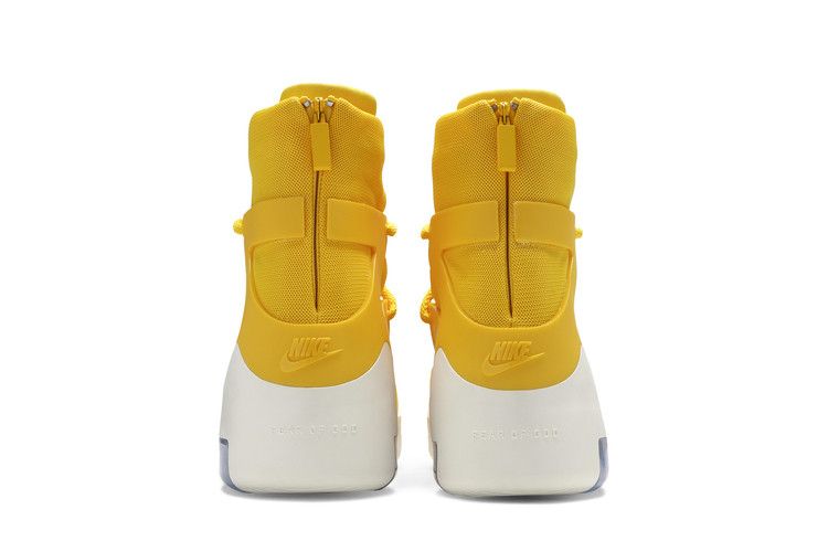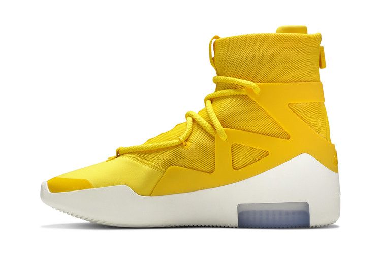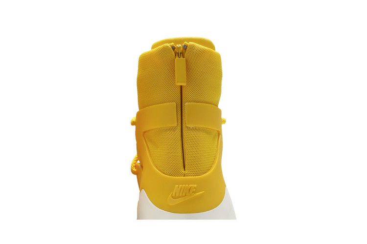 The Nike Air Fear Of God 1 "Yellow" features a breathable mesh upper in a bold yellow hue, paired with a TPU heel and cage inspired by the Air Huarache Light. The design includes a double-height Zoom Air heel unit, a back zipper, and cord laces for a secure fit. Released on July 2019, the Nike Air Fear Of God 1 "Yellow" is available now at Side Kicks.