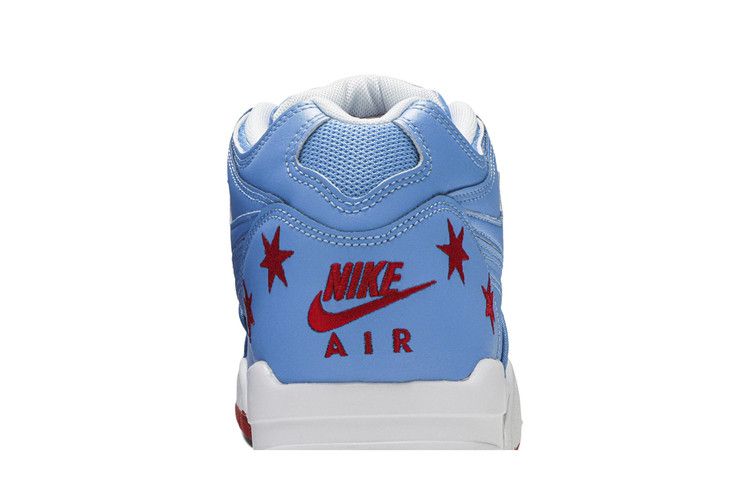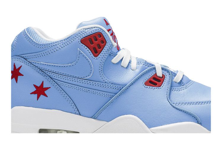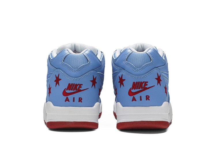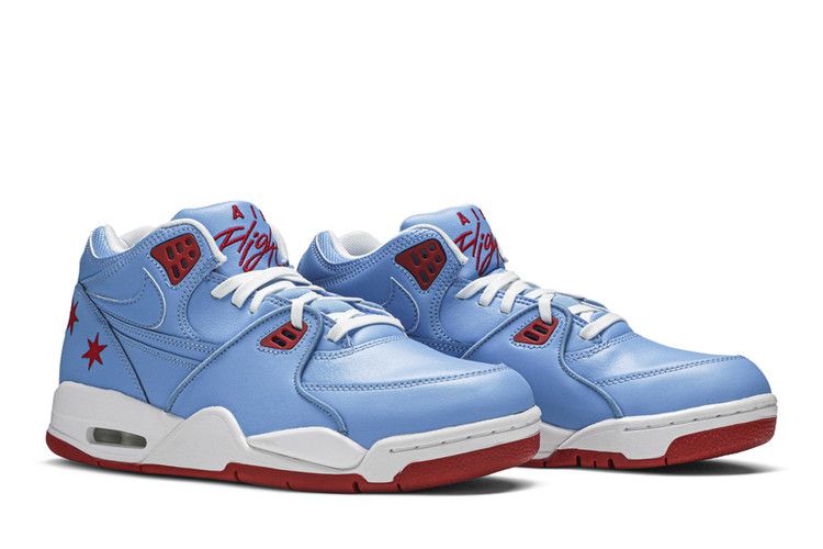 The Nike Air Flight ’89 All-Star Chicago Flag (2020) features a University Blue leather upper with layered forefoot straps and red eyelets. The heel counter showcases University Red six-point stars...