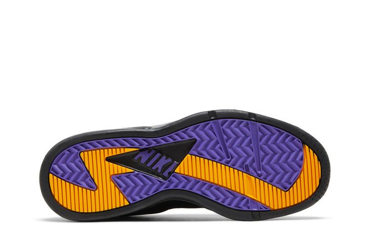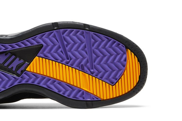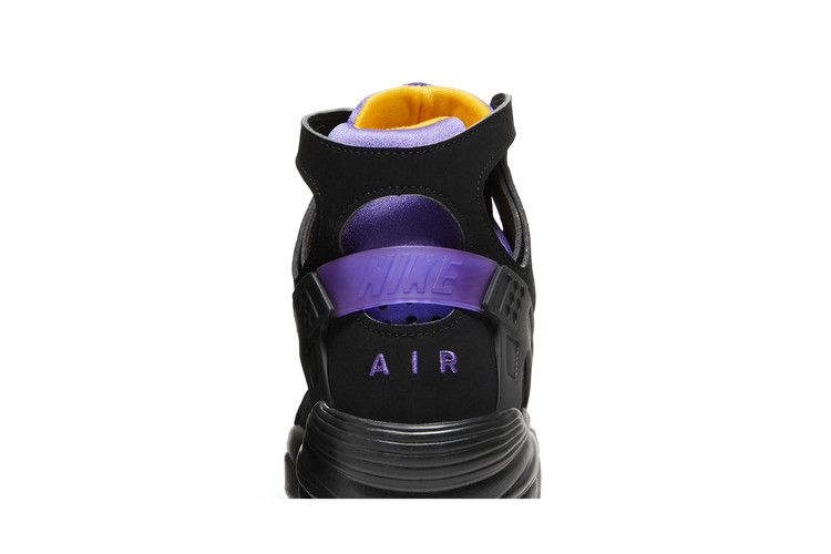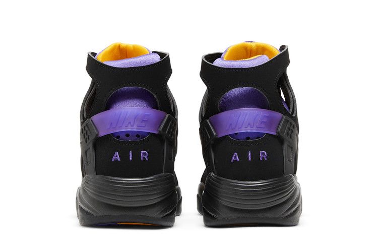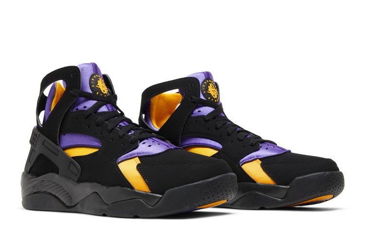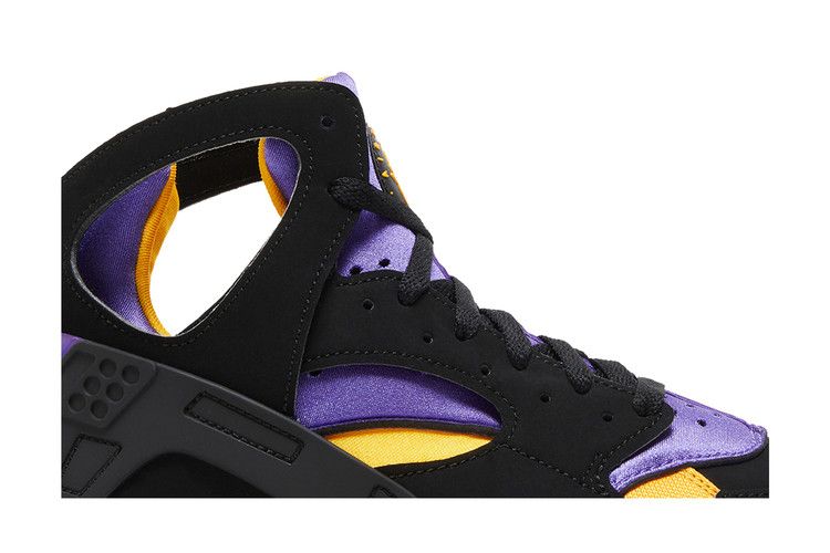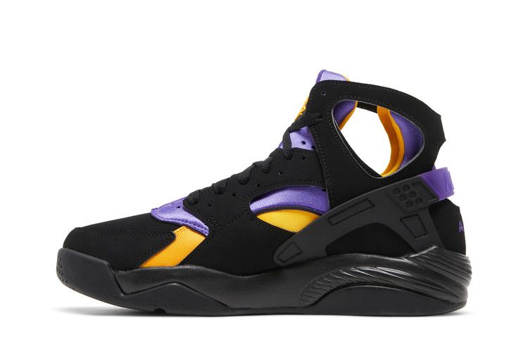 The Nike Air Flight Huarache Lakers Away features the Lakers' purple and gold team colors, matching their away uniform. Cut-outs on the sides and the Huarache logo on the tongue...