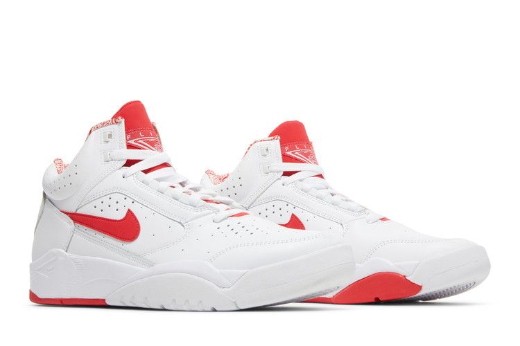 The Nike Air Flight Lite II Mid Scottie Pippen features a white and university red colorway inspired by the Chicago Bulls. Its mid-top silhouette offers ankle support, while Air cushioning provides comfort. The leather upper includes perforations for breathability, with a Nike Swoosh and Pippen's signature on the heel. Released on {date}, the Nike Air Flight Lite II Mid Scottie Pippen is available now at Side Kicks.