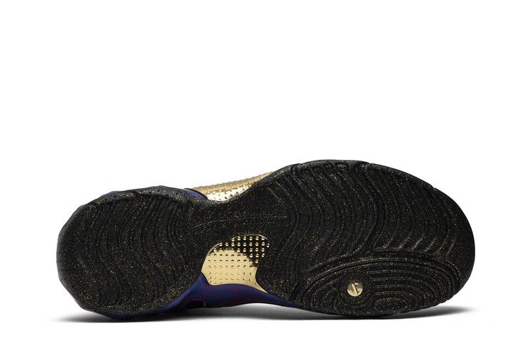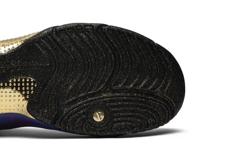 The Nike Air Flightposite 1 Chinese New Year (2019) features bold graphics in University Red and Varsity Purple, celebrating the Lunar New Year. It includes a form-fitting inner bootie with a durable shell and flexible neoprene covering. Metallic Gold accents symbolize prosperity, longevity, and wealth, while the outsole has gold flecks on a black base. A zipper graphic resembles two hands.