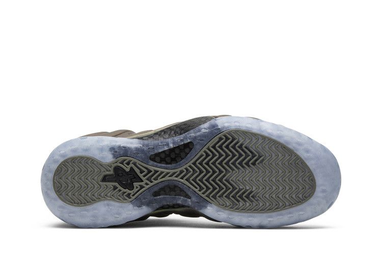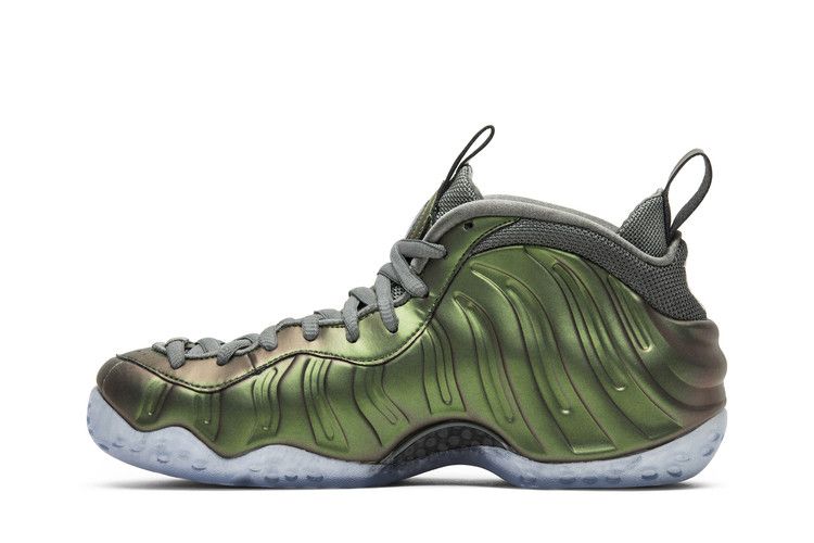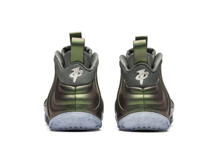 The women's Nike Air Foamposite "Shine" features a dark stucco and black colorway with a green Foamposite upper and iridescent accents. It includes an icy blue translucent outsole and was...