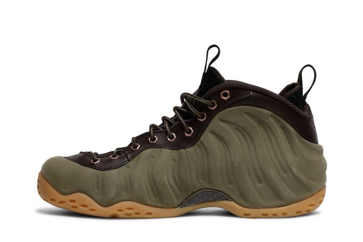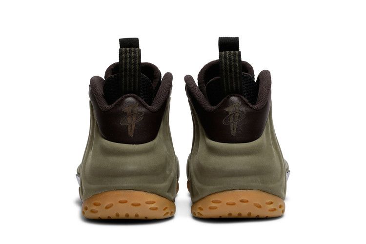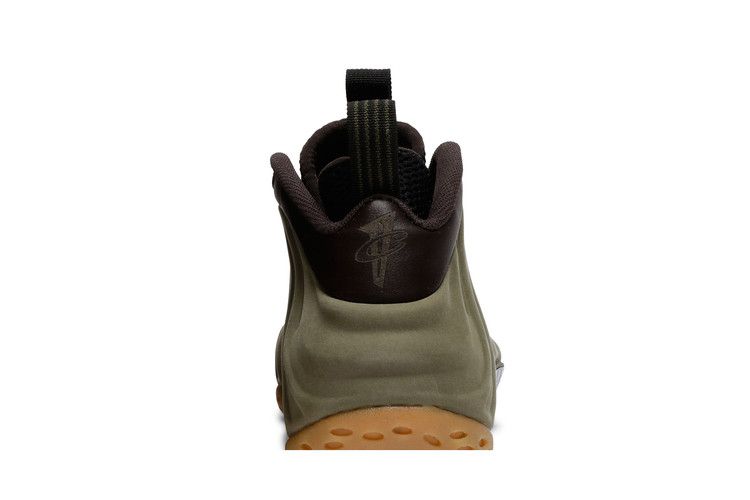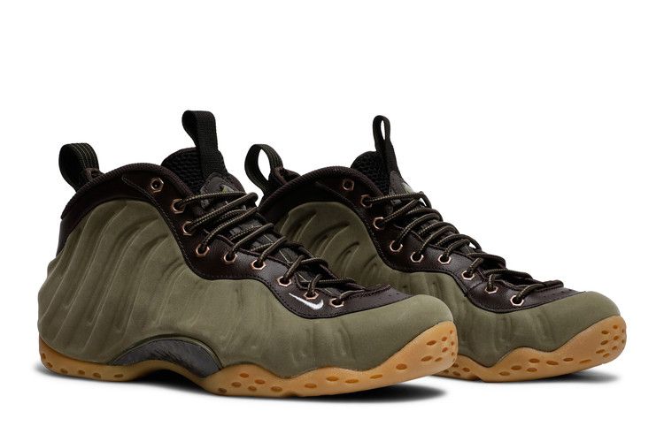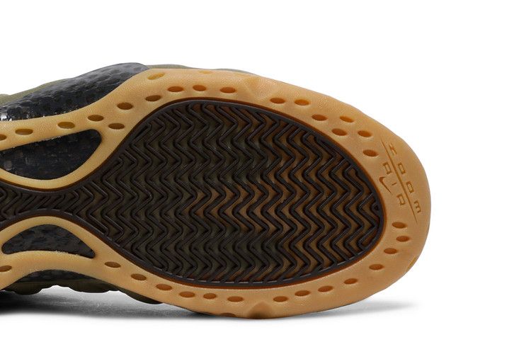 The Nike Air Flightposite One Legion Green has a dark olive green Foamposite upper with an iridescent finish and a black neoprene bootie with a zipper closure. It includes black...