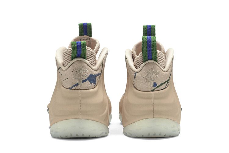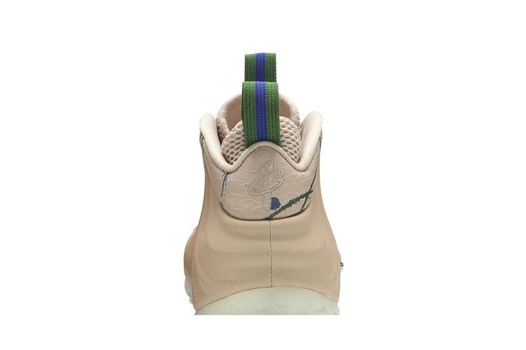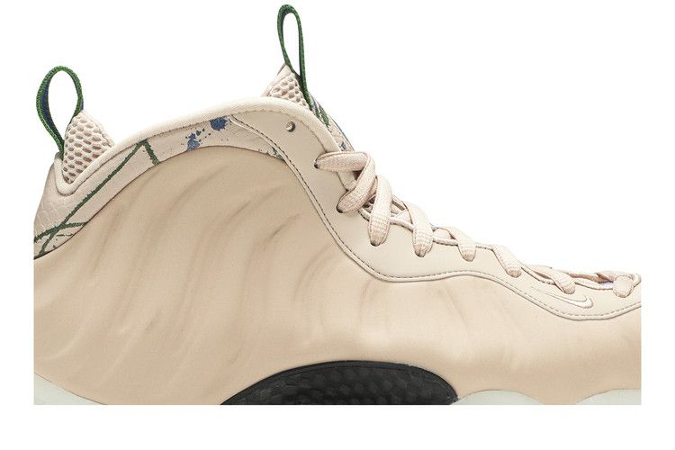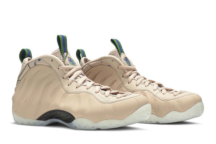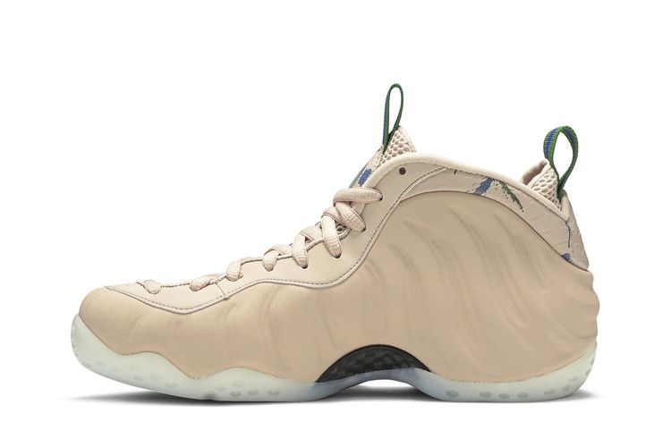 The Nike Air Foamposite One Particle Beige (W) has a Foamposite shell with a matte finish, paired with an icy sole and blue-green heel and tongue accents. It includes embroidered...