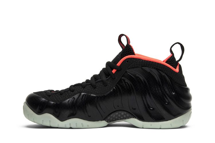 The Nike Air Foamposite Pro Yeezy features a black/laser crimson colorway with carbon fiber prints on the upper. Neon red accents highlight the black upper, complemented by a glow-in-the-dark outsole....
