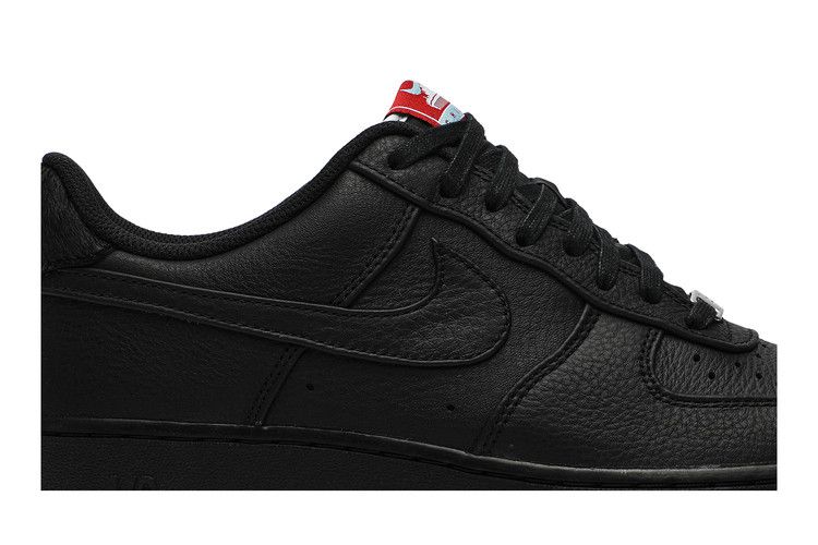The Nike Air Force 1 Low Chicago (2019) features a tumbled black leather upper with perforations for airflow. Leather panels cover the toe cap, eyestays, and heel, while a black...