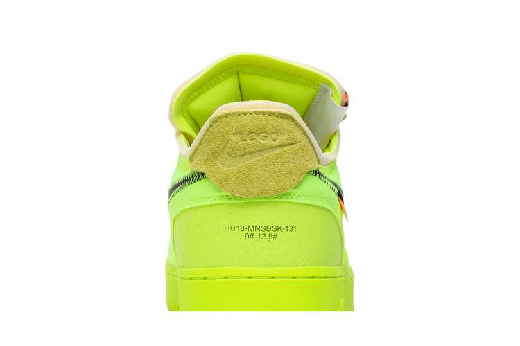 The Nike Air Force 1 Low Off-White Volt features a vibrant volt colorway on the upper, laces, and midsole. The mixed-material construction and contrasting black accents on the Swoosh and quarter panel add visual interest. Designed by Virgil Abloh, these sneakers offer a unique twist on the classic Air Force 1 silhouette. Released in December 2018, these shoes are a must-have for sneaker enthusiasts.