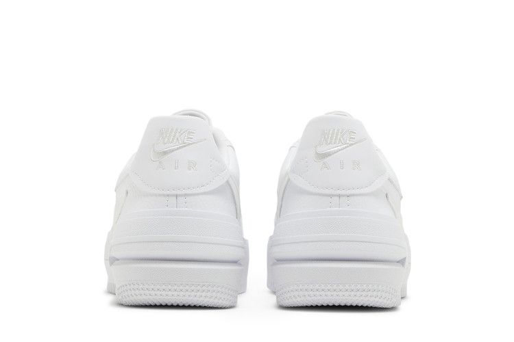The Nike Air Force 1 PLT.AF.ORM Triple White (Women's) features a tumbled leather upper with layered paneling on the lateral collar and cut-out Swooshes. Smooth leather accents the tongue, Swooshes,...