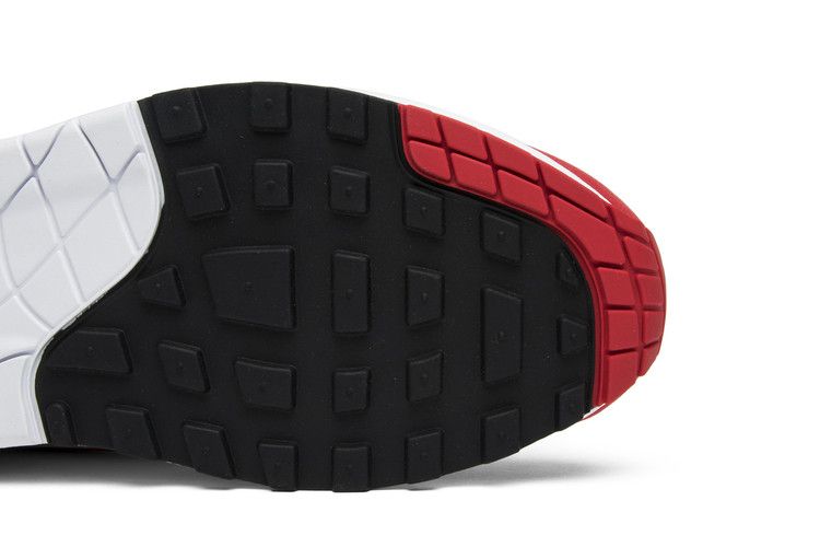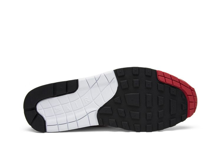 The Nike Air Max 1 Anniversary Obsidian features a white nylon upper with neutral grey and obsidian suede overlays. The midsole is white, while the outsole includes subtle obsidian and red accents. Obsidian Swoosh logos appear on both sides, with Nike Air branding on the tongue and heel. Released on December 15, 2017, the Nike Air Max 1 Anniversary Obsidian is available now at Side Kicks.