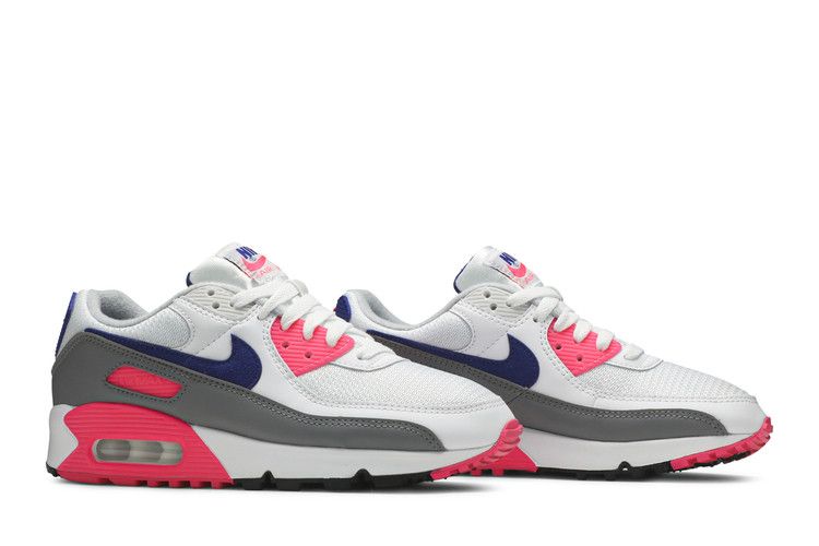 The Nike Air Max 3 White Pink Blast (W) features a white leather and synthetic mesh upper with gray mudguard overlays and navy blue Swoosh accents. The midsole combines white...