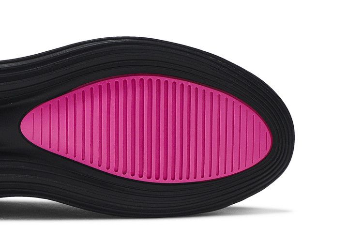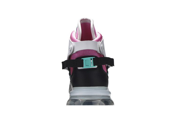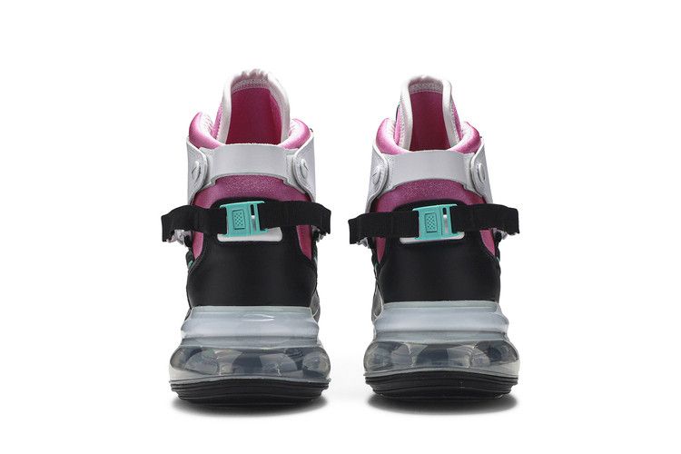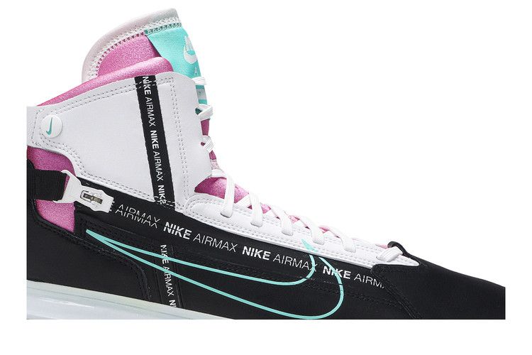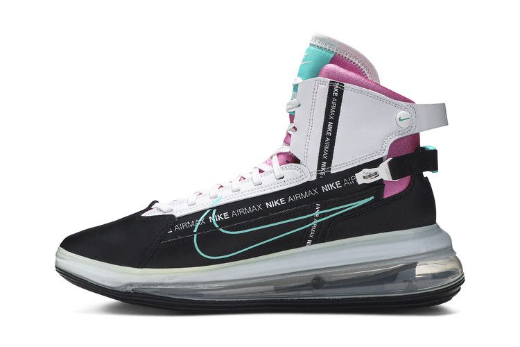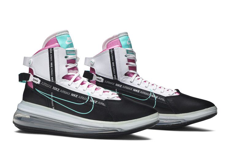 The Nike Air Max 720 Satrn South Beach features a basketball-inspired design with a bright pink, teal, white, and black color palette. Its technical upper combines neoprene and leather, accented with zippers and a heel clip for a layered look.