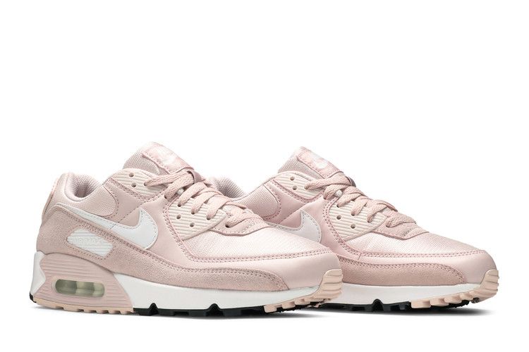 The Nike Air Max 90 White Barely Rose (W) features a leather and suede upper with rubber soles. The colorway combines crimson tint, platinum tint, white, and barely rose hues....