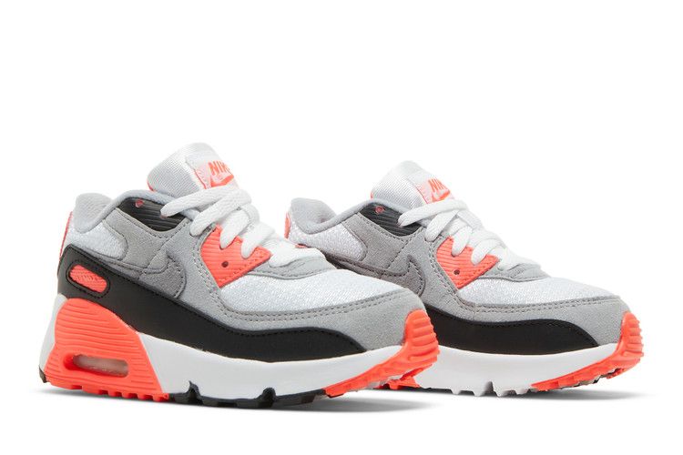 The Nike Air Max 90 Infrared (2020) (TD) features a breathable textile upper in light gray with suede overlays and dark gray Swoosh branding. Infrared accents highlight the eyestays and...