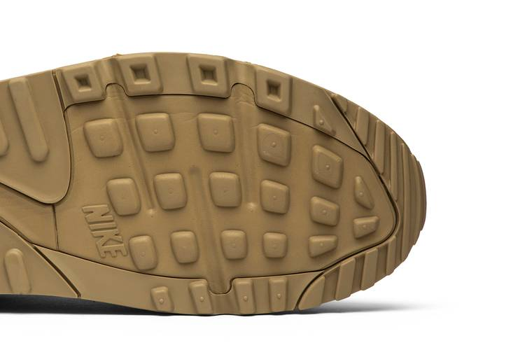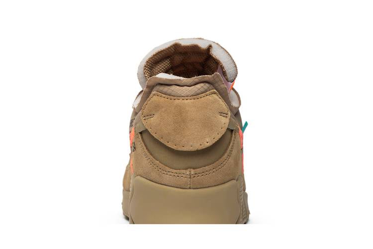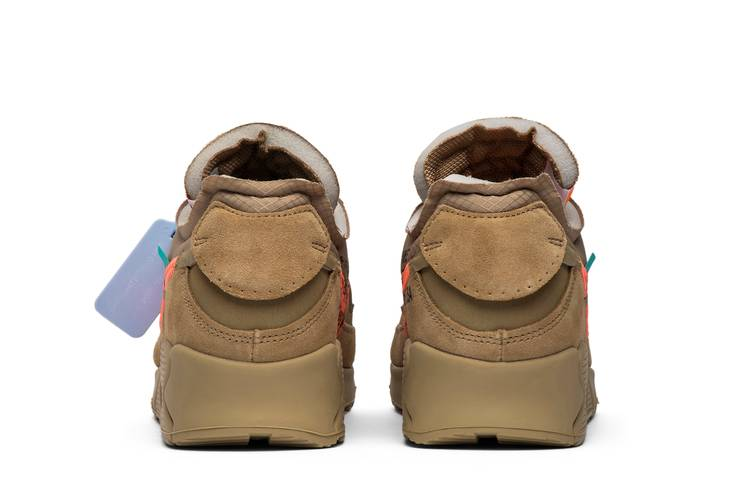 The Nike Air Max 90 Off-White Desert Ore features a mixed-material upper in a warm tan shade, with a stitched-on Bright Mango Swoosh and signature Virgil Abloh details like a...