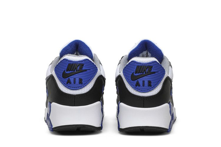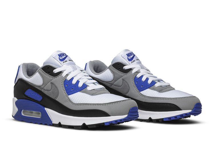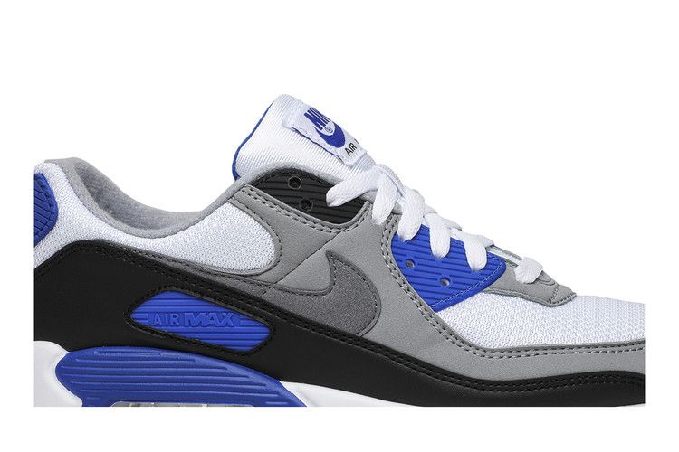 The Nike Air Max 90 Recraft Royal features a leather and suede upper in white, particle grey, and hype royal. The mesh upper includes black leather mudguards and grey suede...