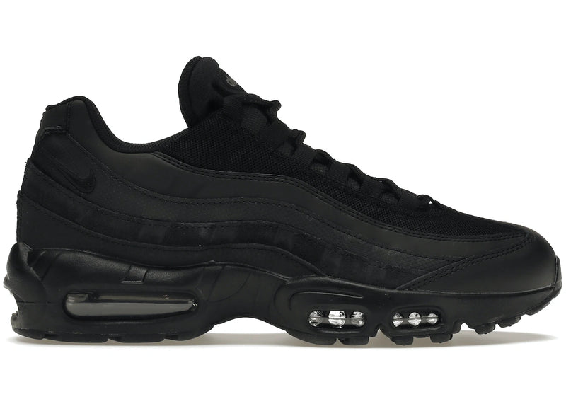 The Nike Air Max 95 Essential Triple Black features a black upper crafted from leather and suede, with mesh detailing on the tongue. It includes a black midsole and rubber outsole, with white "Air Max" and "Nike Air" branding for contrast. Additional accents include a plastic shank and grey flecks in the laces.