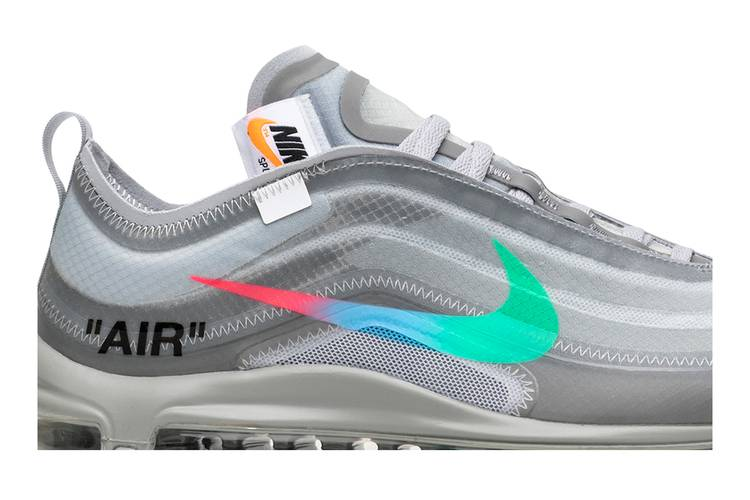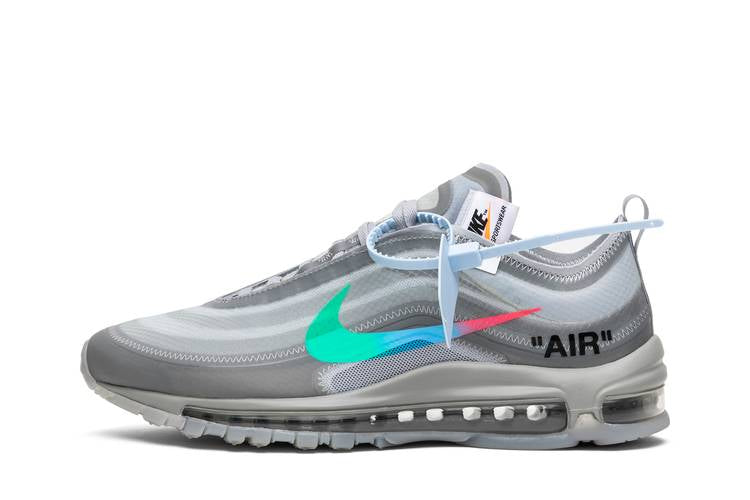 The Off-White x Air Max 97 ‘Menta’ features a translucent textile upper finished in Wolf Grey, with Virgil Abloh’s signature text and tonal zigzag stitching. A multicolored Swoosh transitions from green to blue to red, while a smoky grey rubber outsole maintains the translucent theme. Released in October 2018, these sneakers are a must-have for fans of the Off-White and Nike collaboration. Place a Bid on StockX to secure your pair.