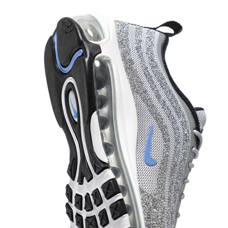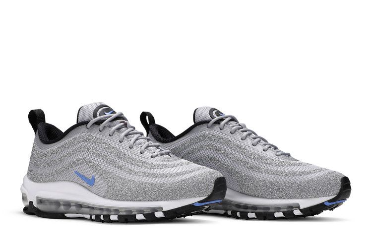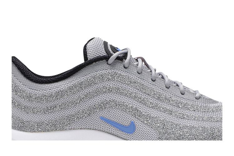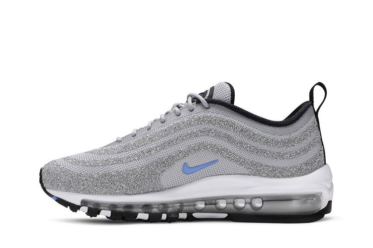 The Nike Air Max 97 Swarovski Polar Blue features an upper covered in Swarovski crystals, layered over a grey mesh for flexibility and breathability. The design includes Polar Blue accents...