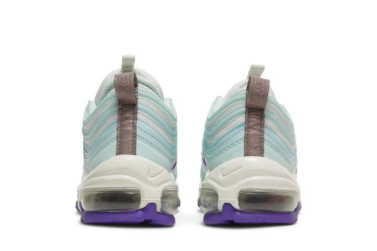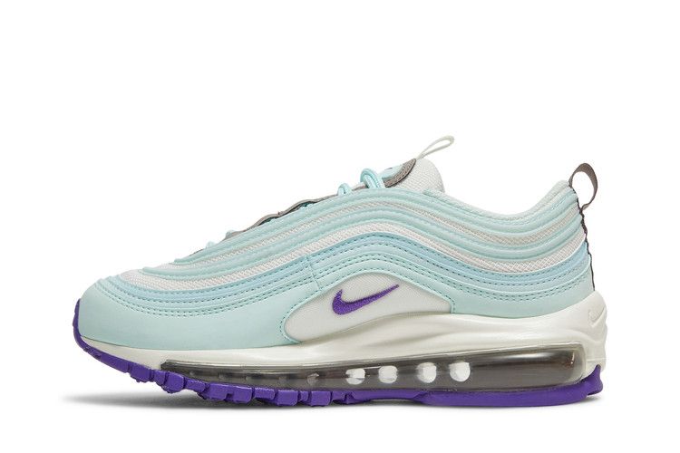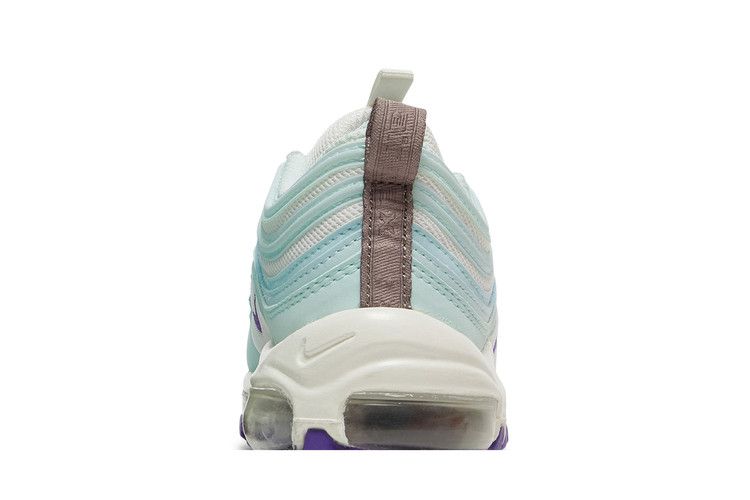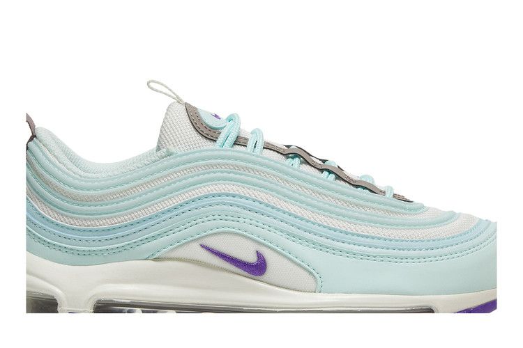 The Nike Air Max 97 Teal Tint (Women's) features a lightweight white mesh upper with curved synthetic leather strips in pale green and blue. Gray synthetic overlays accent the tongue...