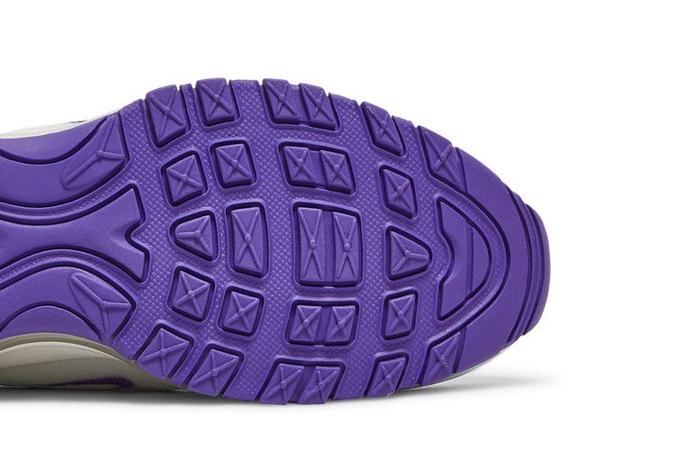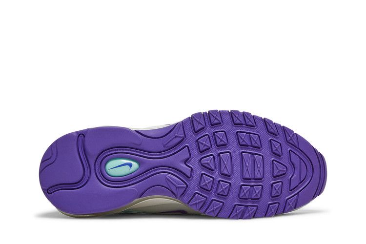 The Nike Air Max 97 Teal Tint (Women's) features a lightweight white mesh upper with curved synthetic leather strips in pale green and blue. Gray synthetic overlays accent the tongue and heel, while a full-length Max Air capsule provides cushioning. Purple accents on the lugged rubber outsole and embroidered Swoosh complete the design. Released on May 1, 2019, the Nike Air Max 97 Teal Tint (Women's) is available now at Side Kicks.