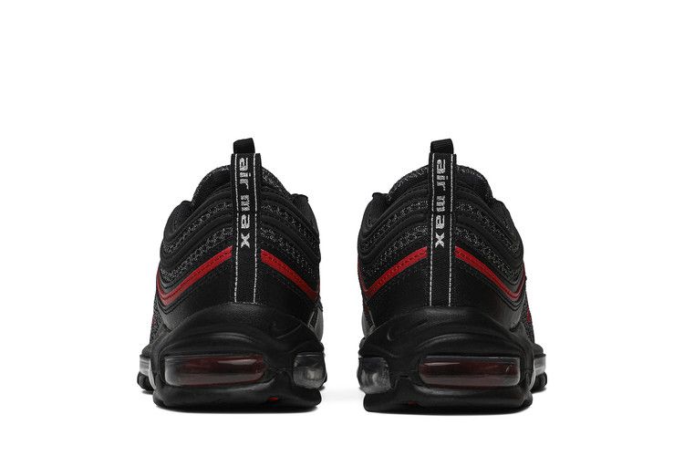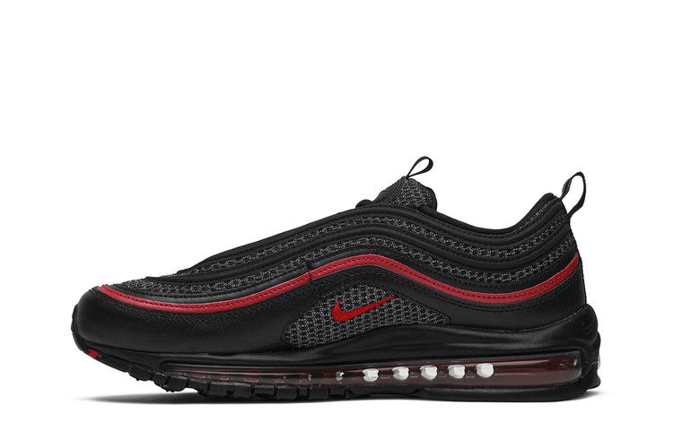 The Nike Air Max 97 Valentine's Day (2020) (Women's) features a black and silver mesh upper with black leather overlays in the signature Air Max 97 wave pattern. A red...