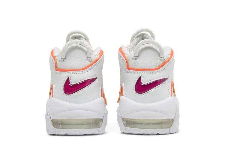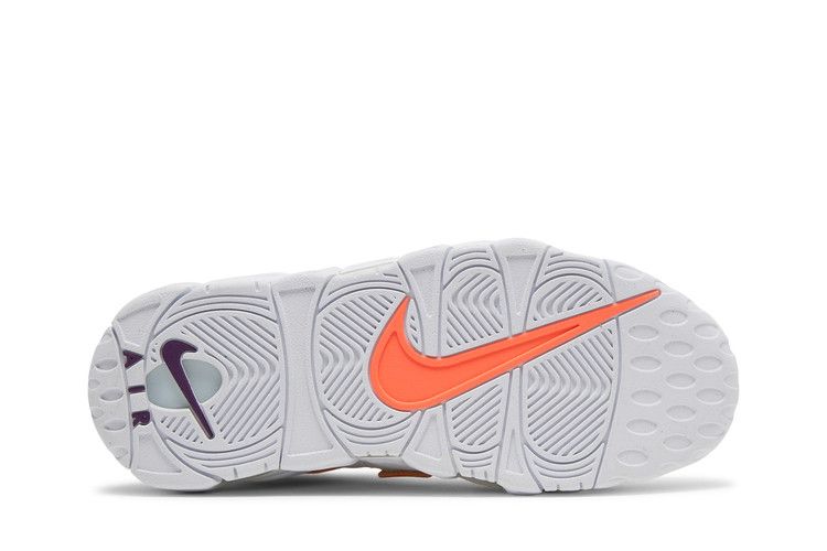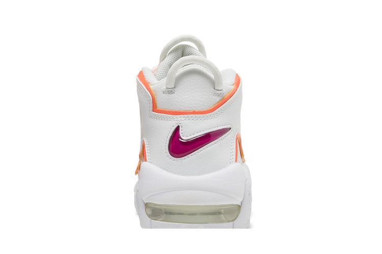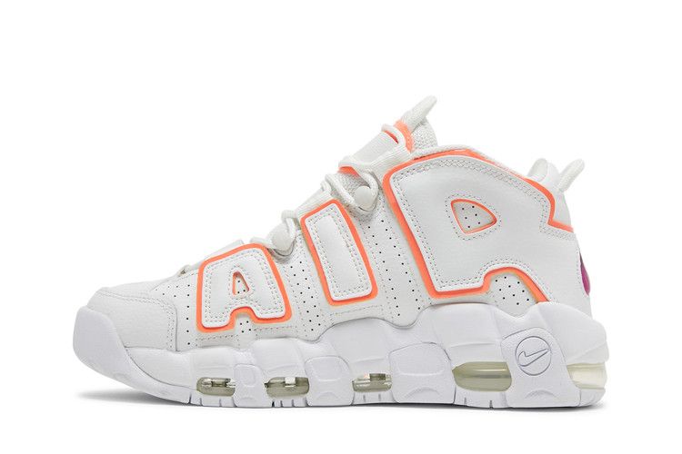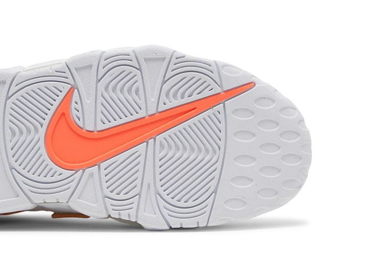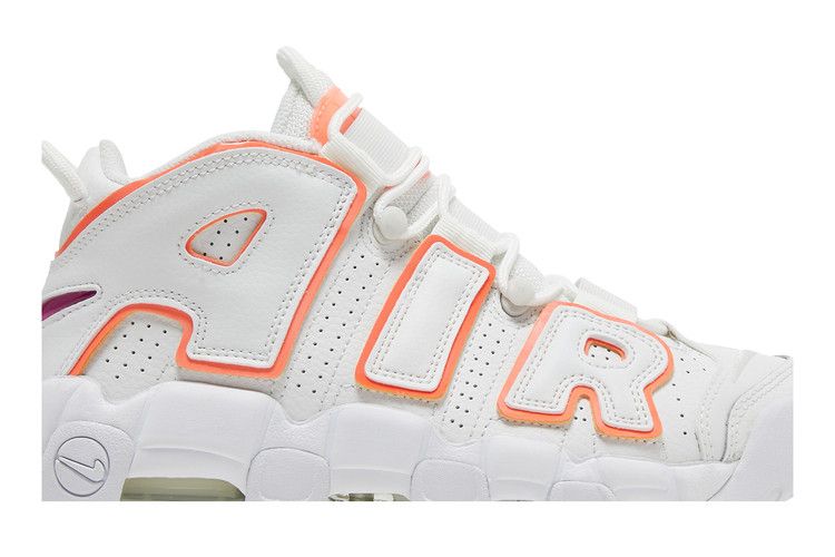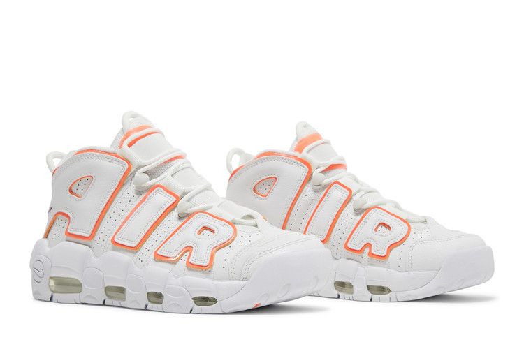 The Nike Air More Uptempo Sunset (Women's) features a white perforated leather upper with oversized Air logo overlays in Sunset orange. The design includes a chunky white midsole with four...