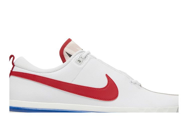 The Nike Air Sesh White Varsity Red Royal features a white leather upper with red accents on the tongue lining, Swoosh, and heel pull tab, plus a blue midsole stripe....