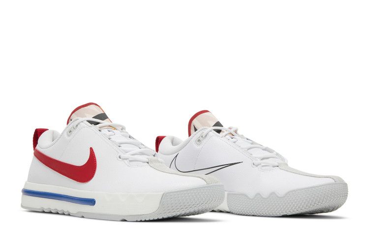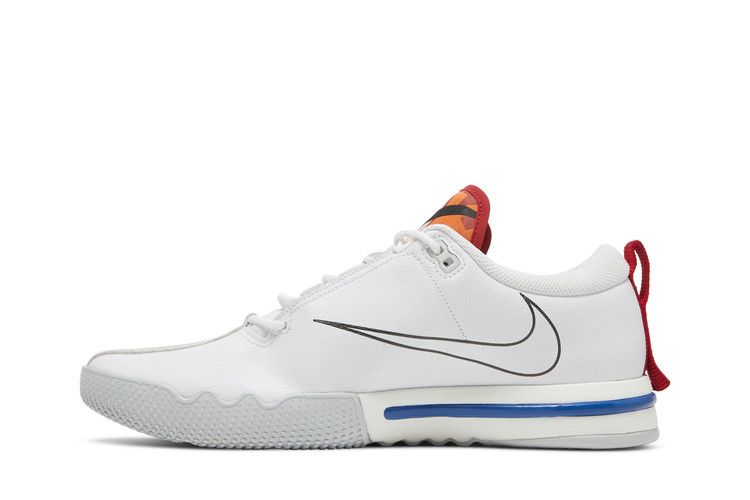 The Nike Air Sesh White Varsity Red Royal features a white leather upper with red accents on the tongue lining, Swoosh, and heel pull tab, plus a blue midsole stripe. The sole combines two rubber types for reduced resistance and friction. Zoom Air cushioning in the heel and Cushlon in the midsole offer comfort and support for dance movements. Released on October 2021, the Nike Air Sesh White Varsity Red Royal is available now at Side Kicks.