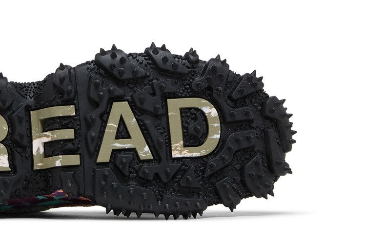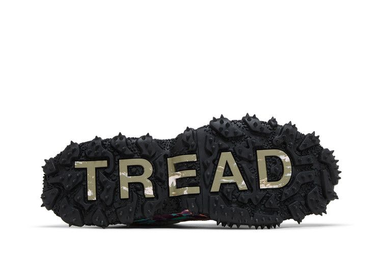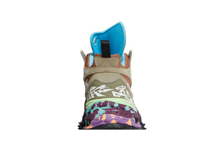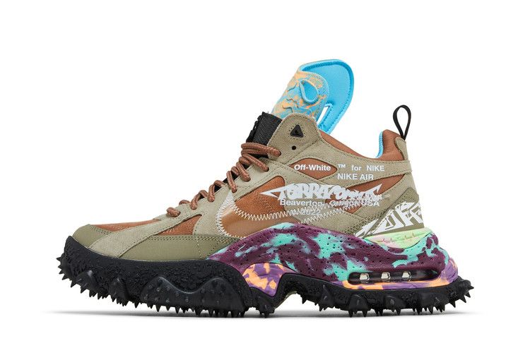 The Nike Air Terra Forma Off-White Archaeo Brown features a high-top upper blending hiking boot and basketball shoe elements. It includes a rugged black outsole with angled spikes and a textured base. The marbleized tongue and midsole showcase vibrant colors, while visible Air units provide heel cushioning. Exposed stitching enhances the hybrid design. Released on December 21, 2023, the Nike Air Terra Forma Off-White Archaeo Brown is available now at Side Kicks.