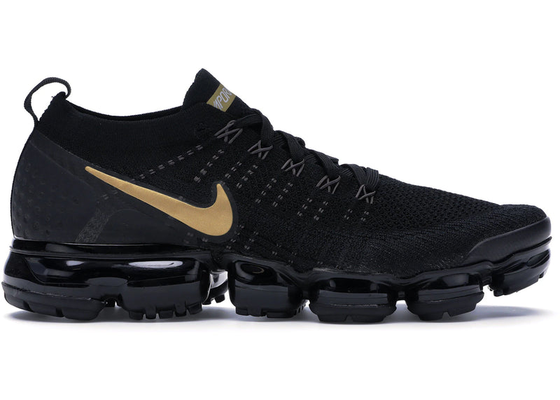 The Nike Air VaporMax 2 Black Metallic Gold (Women's) has a low-top Flyknit upper in black, Metallic Platinum, Vast Gray, and Metallic Gold. It includes asymmetrical Swoosh logos and Metallic Gold accents on the tongue branding. The translucent VaporMax Air unit provides cushioning, while Flywire cables offer support. Rubber pods on the outsole improve traction, and a heel-pull strap ensures adjustability.