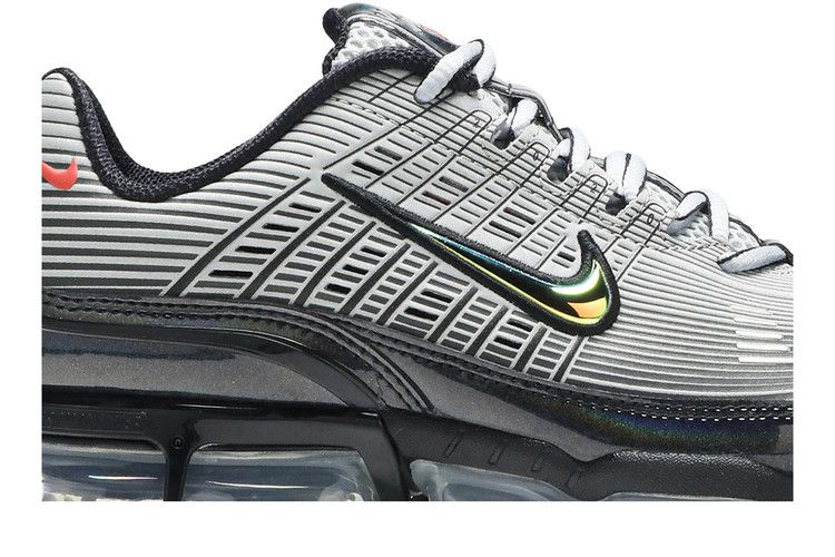 The Nike Air VaporMax 360 Metallic Silver (Women's) features a grey upper with black accents, a chrome Swoosh, and iridescent mudguards. Reflective details enhance visibility in low light. The clear VaporMax cushioning unit provides responsive comfort, combining Air Max 360 and VaporMax technologies.