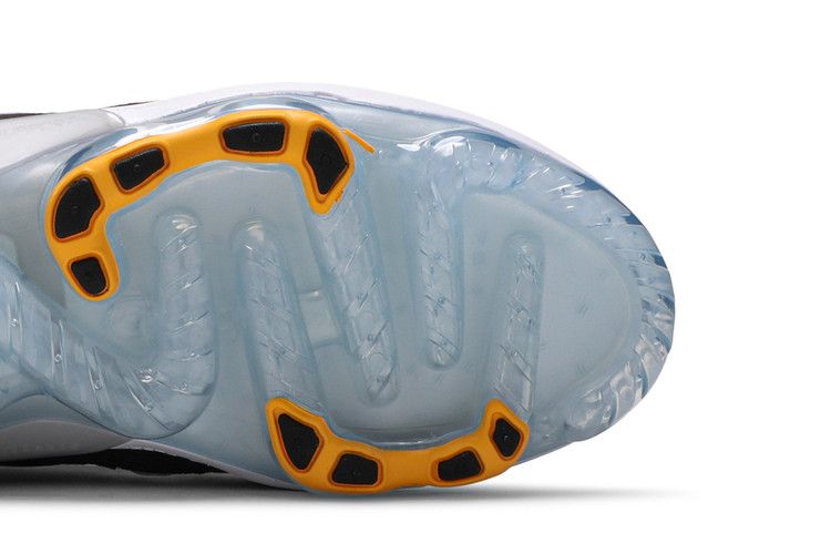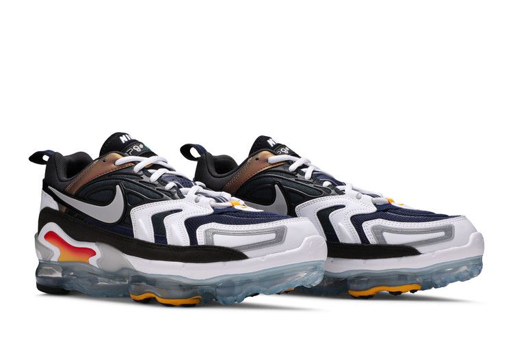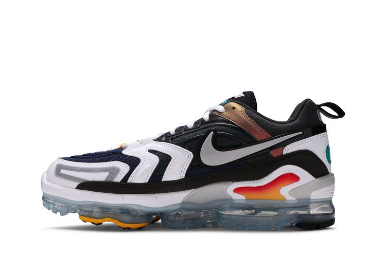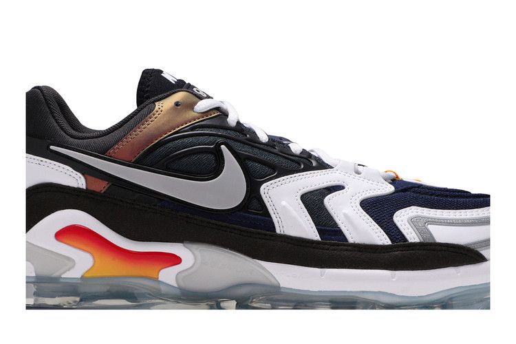 The Nike Air VaporMax Evo Midnight Navy combines yellow, blue, and white color schemes with metallic accents on a Midnight Navy base. White leather covers the vamp, heel tab, and...