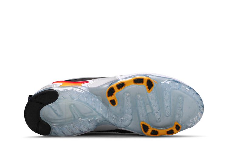 The Nike Air VaporMax Evo Midnight Navy combines yellow, blue, and white color schemes with metallic accents on a Midnight Navy base. White leather covers the vamp, heel tab, and toe cap, while grey Swooshes feature black piping. Details include dawn gradient midsoles, turquoise branding, and retro-inspired silver accents. The design includes VaporMax EVO heel tabs, rubberized tongue tabs, and printed insoles. A translucent Air sole unit completes the Gundam-inspired look.