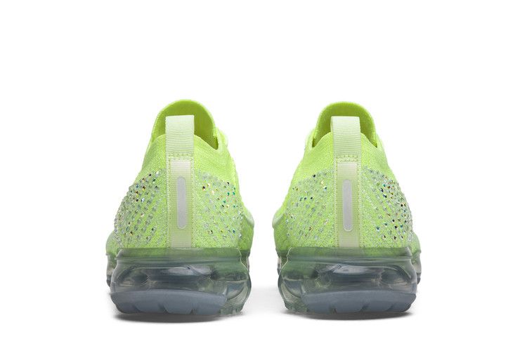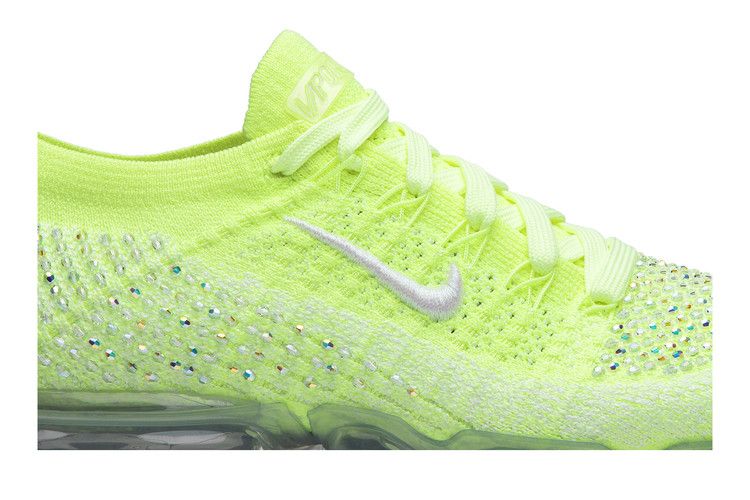 The Nike Air VaporMax FlyKnit 2 LXX Swarovski Volt (Women's) features a lime green FlyKnit upper with ribbed collar detailing for a secure fit. Translucent synthetic overlays provide structure, while embroidered white Swooshes appear on the lateral and medial sides. Over 1,000 dual-finish Swarovski crystals are hand-embroidered onto the upper.