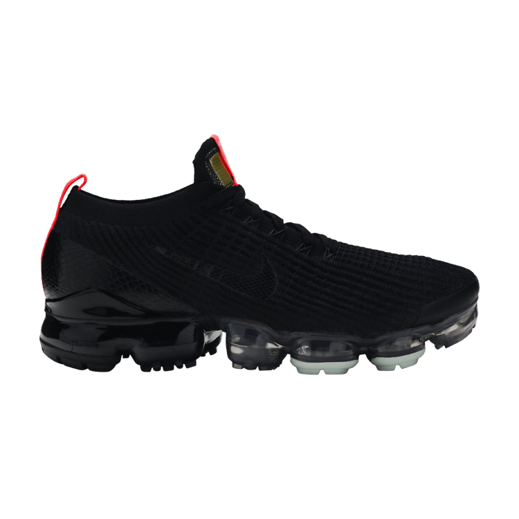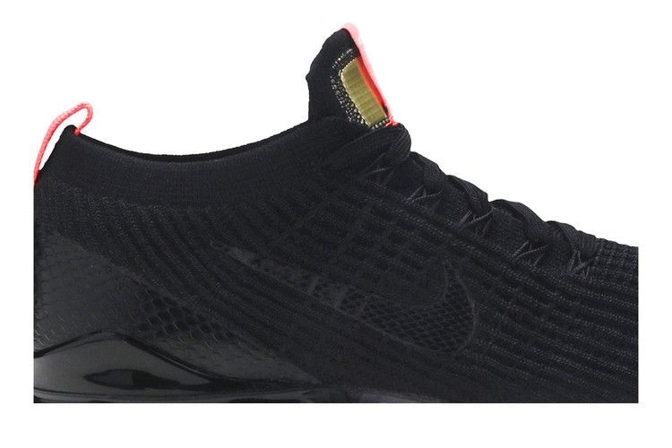 The Nike Air VaporMax Flyknit 3 Black Snakeskin features a black Flyknit upper with a sock-like fit. The medial and lateral side panels include printed Swoosh emblems, while the tongue is covered in gold glitter with crimson accents. A crimson heel tab and VaporMax tag on the ankle medial complete the design.