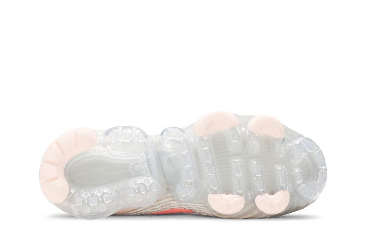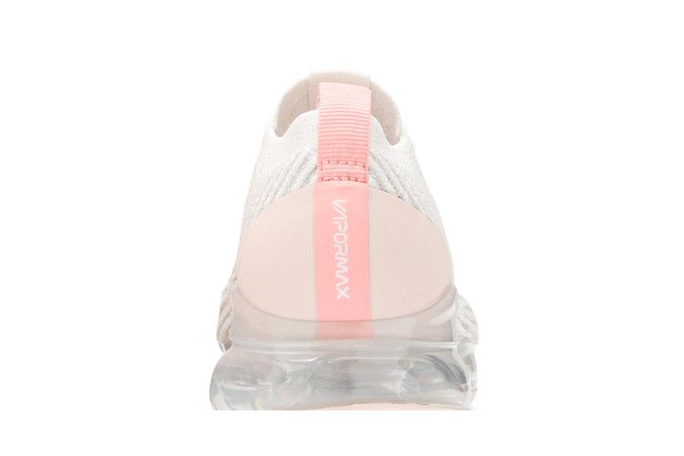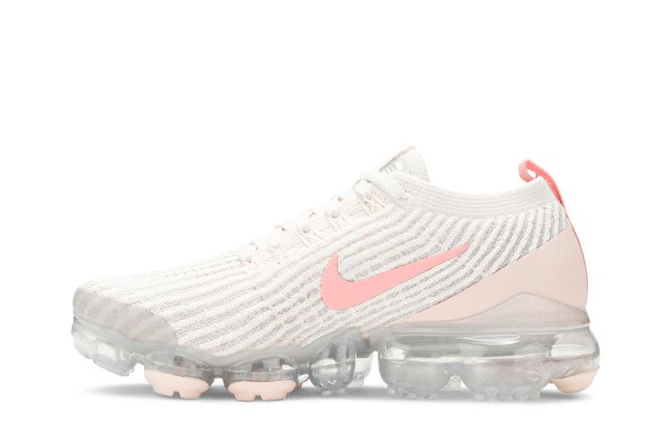 The Nike Air VaporMax Flyknit 3 Light Cream W features a translucent VaporMax sole unit with rubber pods for responsive cushioning. The Flyknit 3 upper combines Light Cream, Crimson Tint, Vast Gray, and Atomic Pink hues, reinforced with tonal pink Flywire lacing. A rounded toe and sock-like construction provide a snug fit.