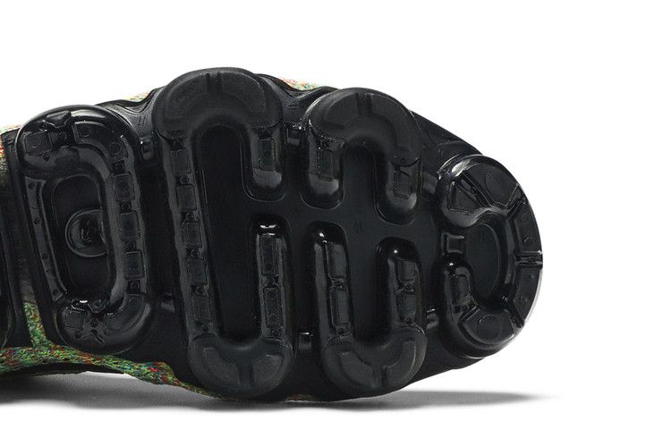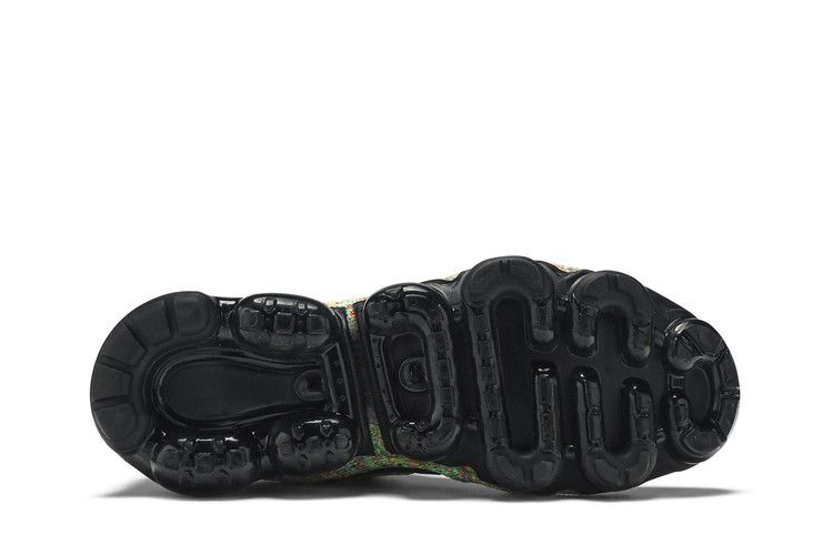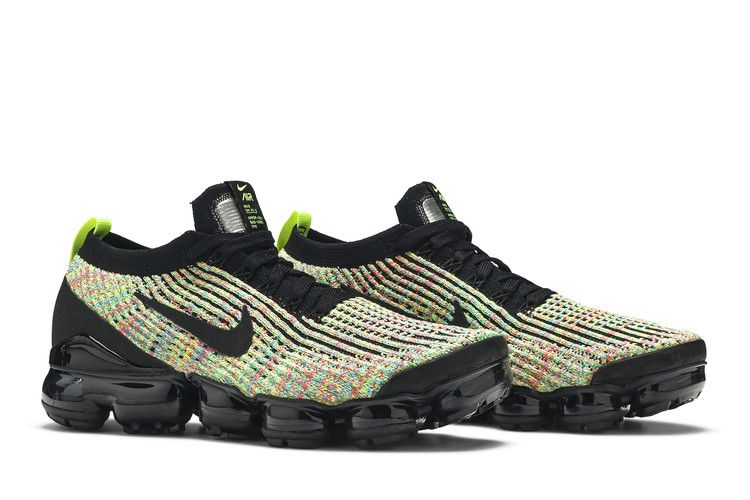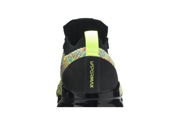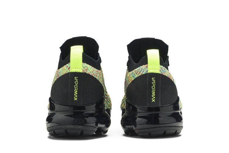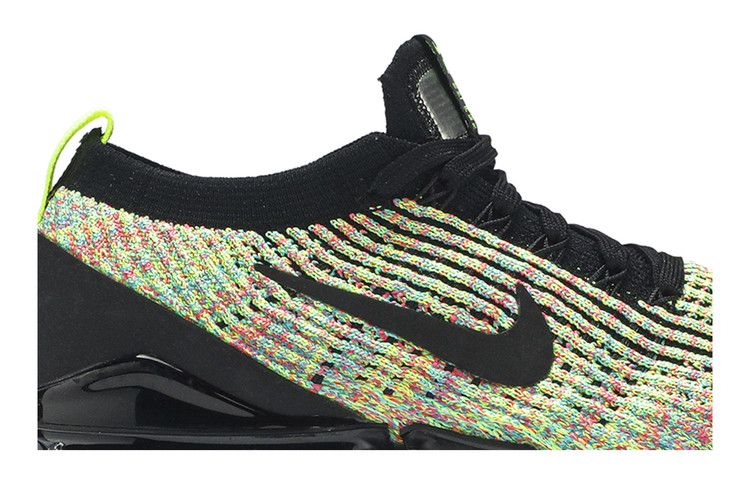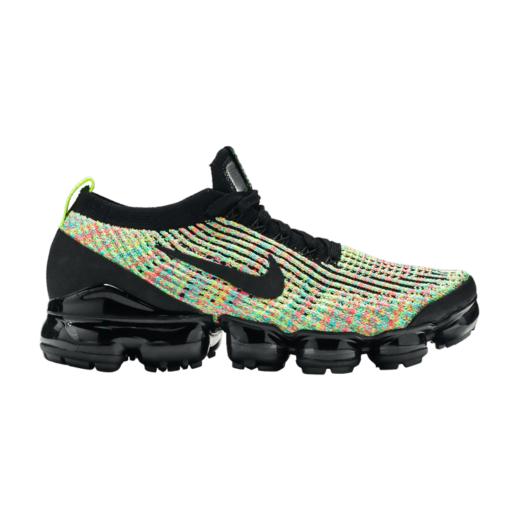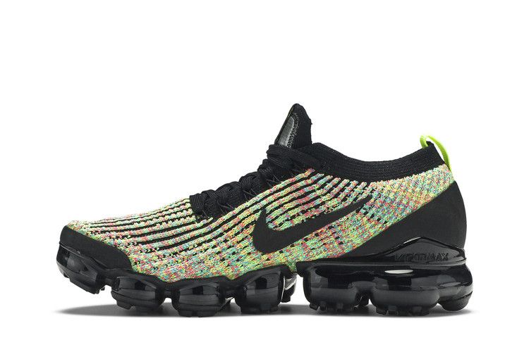 The Nike Air VaporMax Flyknit 3 Multi-Color (Women's) features a Flyknit upper with vibrant multicolor hues against a black base. The design includes a black Max Air sole, heel counter,...
