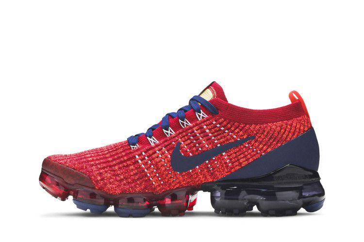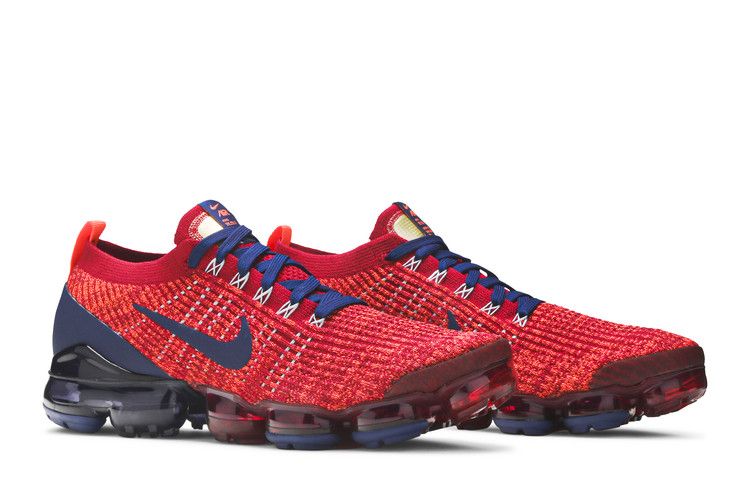 The Nike Air VaporMax Flyknit 3 Noble Red Blue Void features a low-top design with a stretchable Flyknit 3 upper in noble red and blue void accents. The blue void...