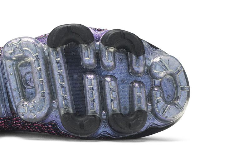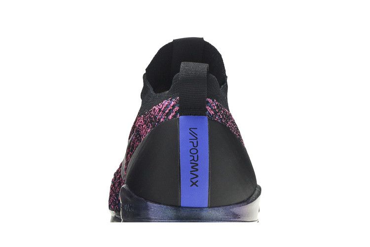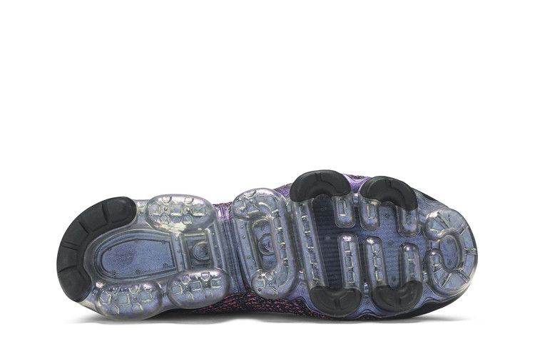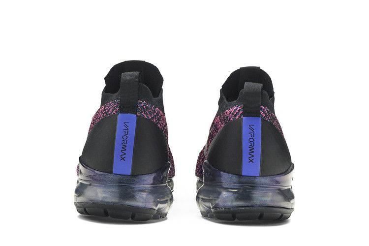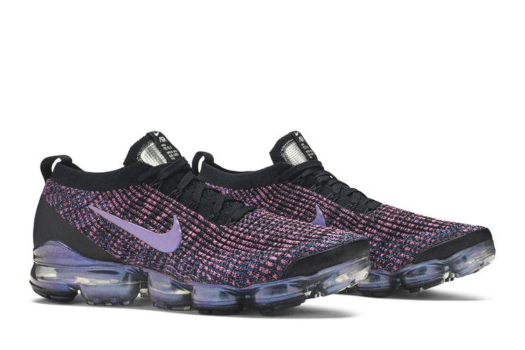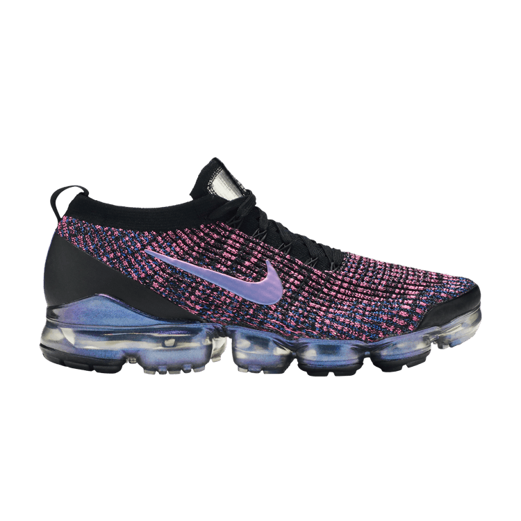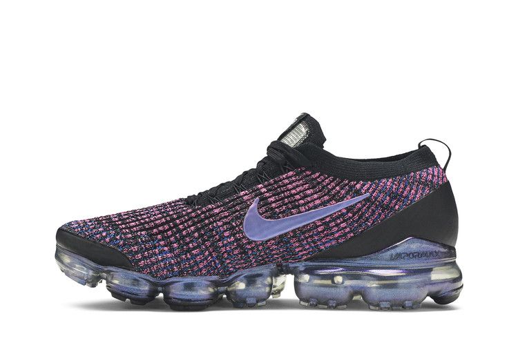 The Nike Air VaporMax Flyknit 3 Throwback Future features a lightweight Flyknit upper with VaporMax cushioning technology, including visible Air pods on the outsole. The design uses a gradient color scheme of purple, pink, and blue, accented with black on the heel and tongue. Released on March 21, 2019, the Nike Air VaporMax Flyknit 3 Throwback Future is available now at Side Kicks.